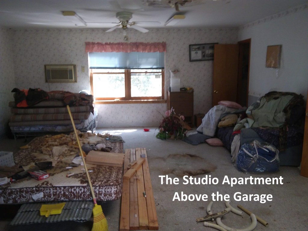 Then there’s the detached 3-car garage with a 2nd floor studio apartment. The garage is filthy and the previous owner left quite a bit of trash. The sheetrock is moldy, obviously from leaks in the roof, and there is no insulation. The studio apartment is not livable, either. The door does not close and it looks like it has not closed for years. There’s a hole in the floor and several of the boards are “spongy” and unsafe to walk on. There’s also a hole in the ceiling where water had come through. The carpet is stained and moldy. There are at least 50 inhabited hornet nests. The bathroom and kitchenette are tiny and disgusting. The water pipes apparently froze in years past, so there’s no running water.