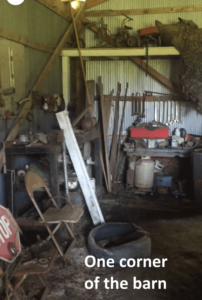 Then there’s the large tin barn. It has a dirt floor. One end of the barn has two 10’ tall sliding doors (big enough to drive heavy equipment through) and the other end has a small entry door. Again, it is filled with JUNK! If you know of someone who wants old tires, please let us know!