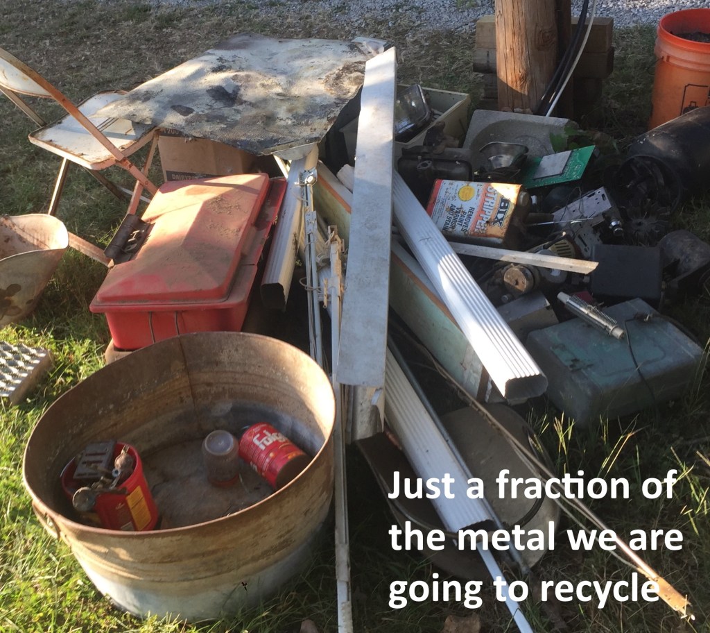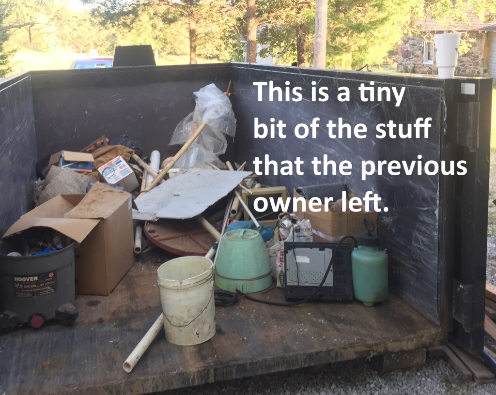 We’ve owned our farm for just two weeks! In that time, we’ve cleaned out the house, studio apartment, garage, and tool shed (we still have 4 more buildings to clean out), we’ve filled a huge dumpster with garbage, a few pick up loads of metal and glass to be recycled, and plenty of fodder for bonfires! We’ve pulled up carpet and ceramic tile in the house.
