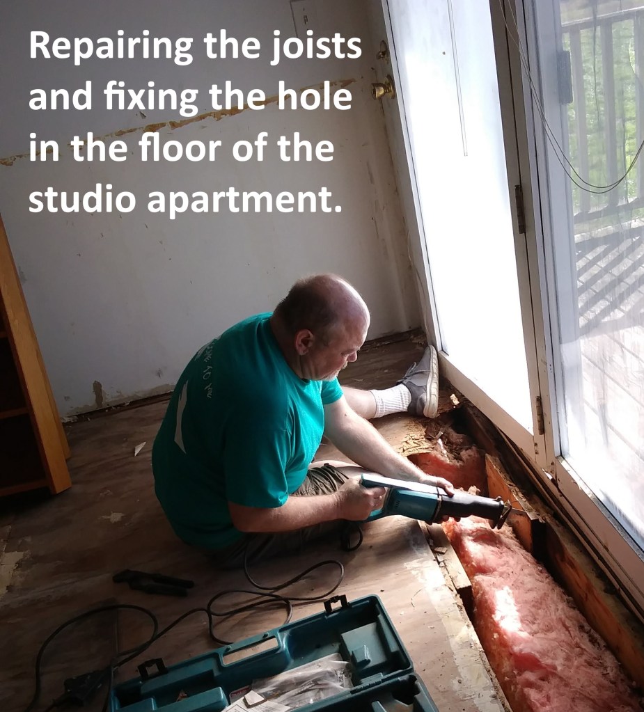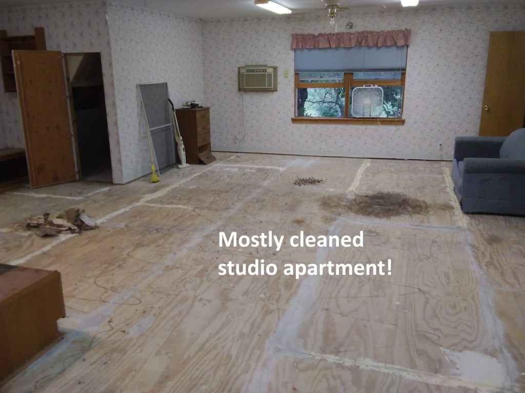 In the studio apartment, we tore down the bathroom walls so we can make it bigger – the original bathroom did not have room for a sink! We removed the kitchenette counters and cabinets and we removed the carpet. The carpet was the most disgusting part! We repaired the joists in both the ceiling and the floor and replaced the rotting flooring. We took down the ugly wallpaper and washed the walls so they are ready for paint.