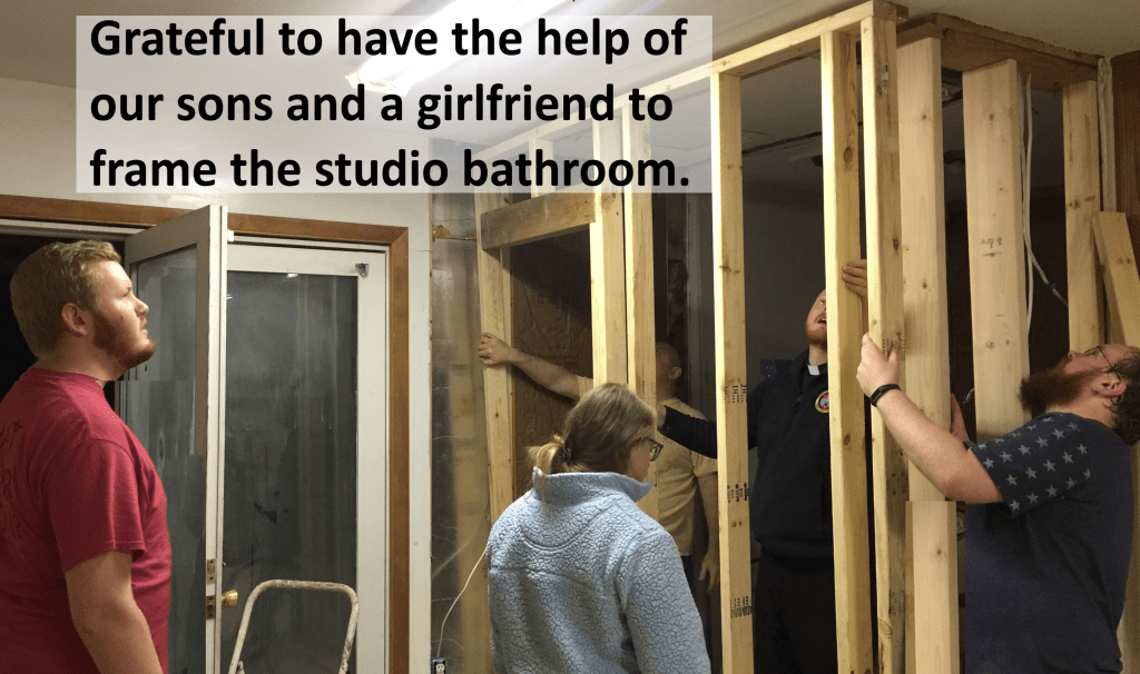 Eight days and counting before we have to be out of our current home and make the studio livable. We have purchased and painted kitchen cabinets. The new bathroom has been framed in. We’ve insulated the exterior walls of the garage and apartment. We textured and painted the walls – with help from some great friends.