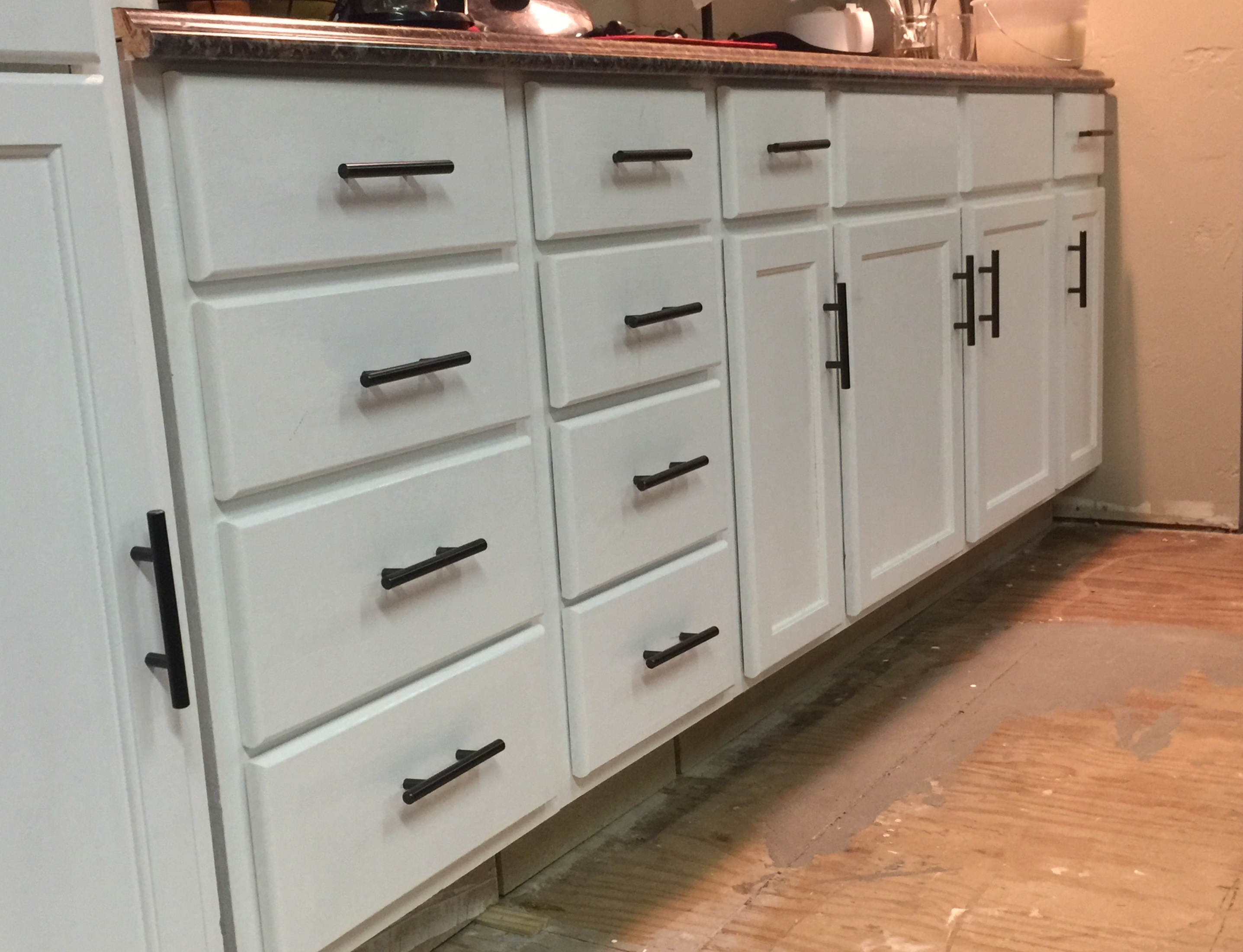 We added hardware to our kitchen cabinets. We installed the barn door to the bathroom, and we LOVE it. Who needs a conventional door? Katie’s parents gave us a medicine cabinet and vanity lights, so we got those installed, too.