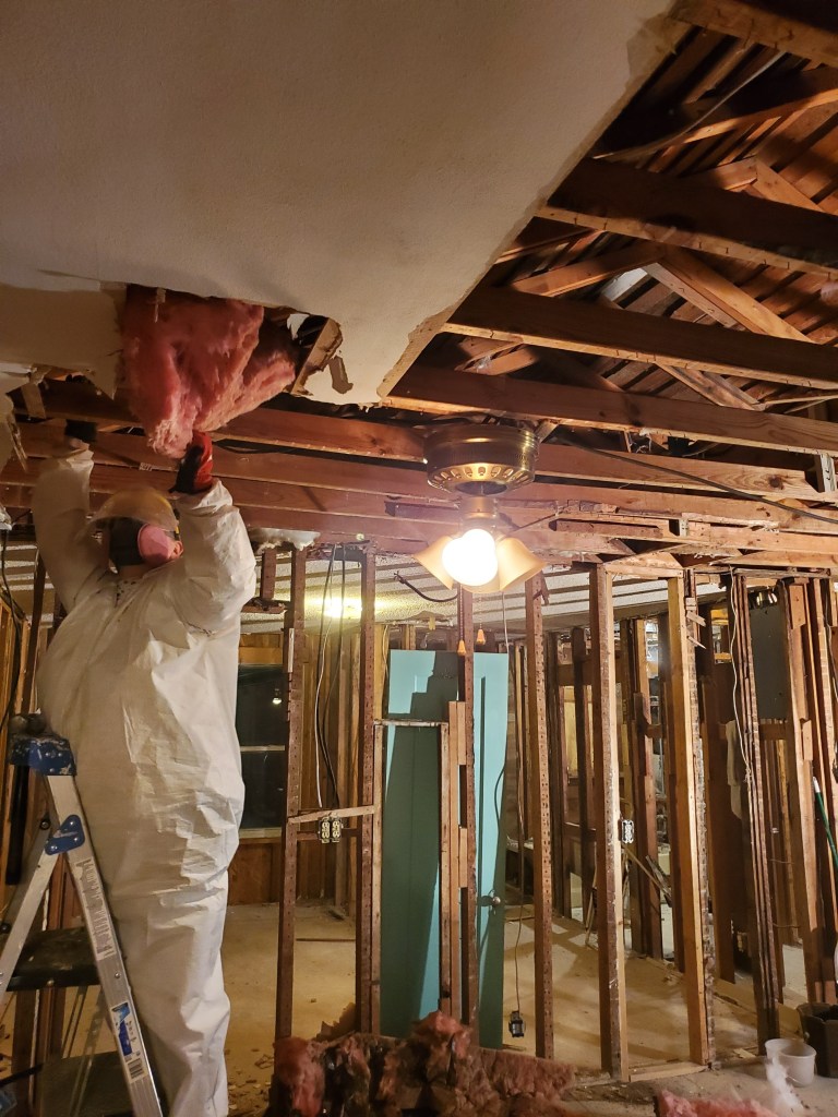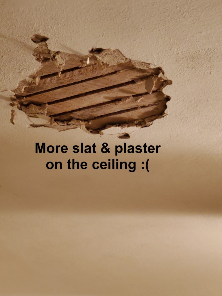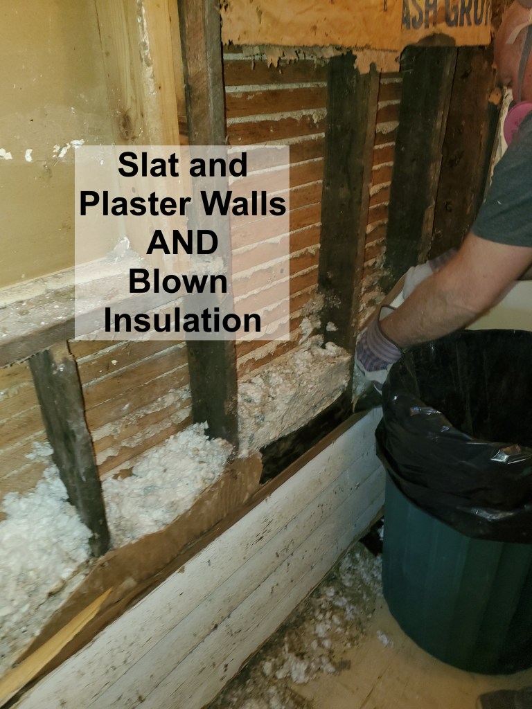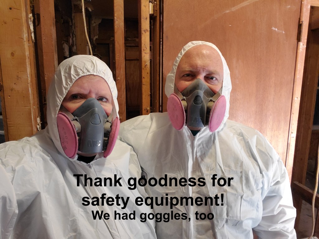 We’ve spent the last 2 weeks taking down the sheetrock walls and some of the ceiling. We were dismayed to find that most of the walls and the ceiling were slats and mortar. That was so hard to take down, and it was a very dirty job. The ceiling is extremely messy as the blown insulation, that has to be as old as the house, comes down with the boards. We are getting good use out of our coveralls and masks!