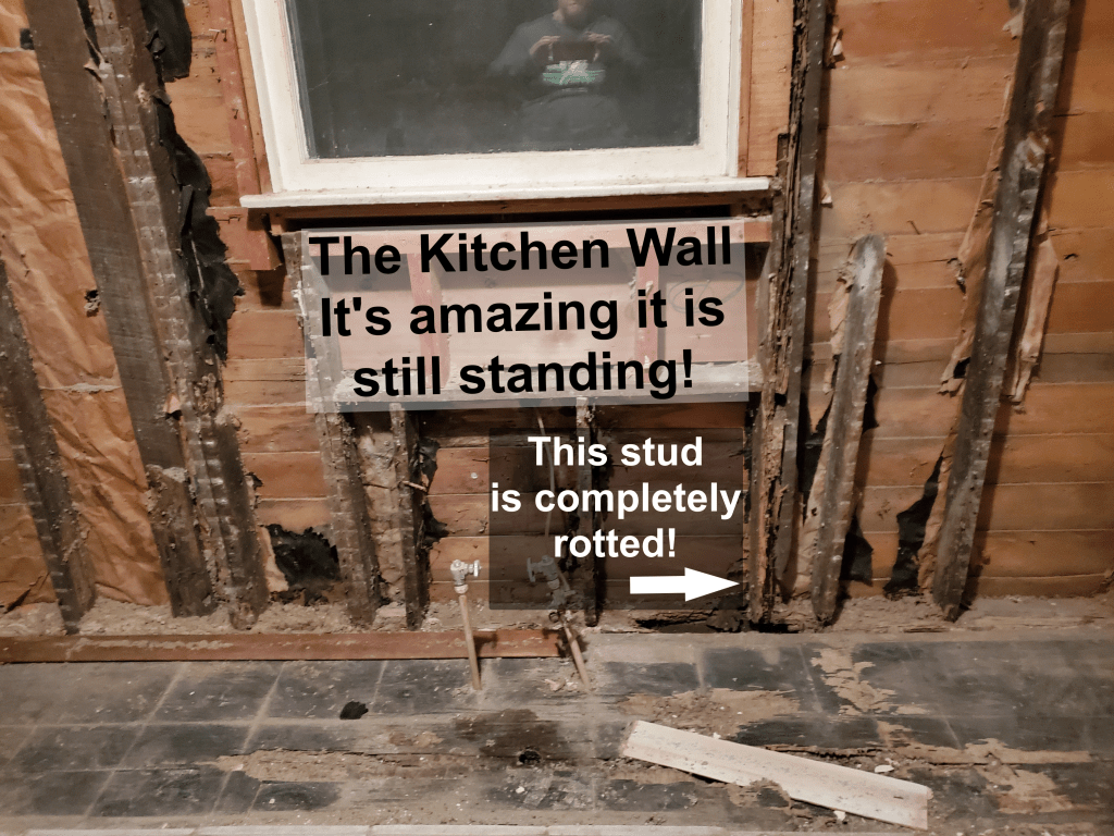 The kitchen wall, which is an exterior wall, was in the worst condition with old termite damage and rot. The studs, top sill and bottom sill are completely rotted! We aren’t sure how the roof is still supported. The floor which was under the sink is rotted. This took us aback. We expected to see some damage, but this was much more than we anticipated. At this point, Katie looked at John and said, “I’m not daunted.” John replied, “Good, neither am I. Bring it on.”