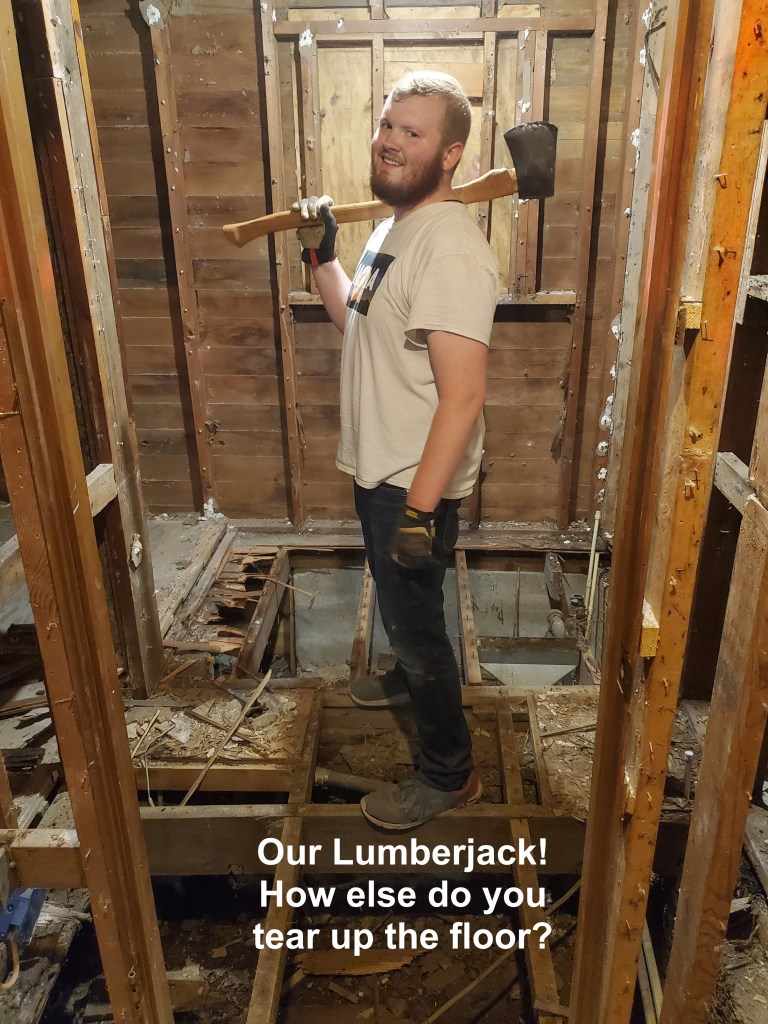 Back to the house- John and Joshua, while removing the tile in the kitchen, discovered the wood planks under the tile were almost completely destroyed by termites in years past. We ended up removing a lot more of the kitchen floor than anticipated. Then Joshua turned his attention to the bathroom floor. He was able to get out quite a bit of his “college at home” stress by going “Lumberjack” and chopping his way through the floor. We discovered that many of the floor joists also had termite damage that will need to be addressed. We hired an engineer to draw up plans to replace the floor supports, the entire kitchen/bathroom wall, and converting the ceiling to a vaulted ceiling.