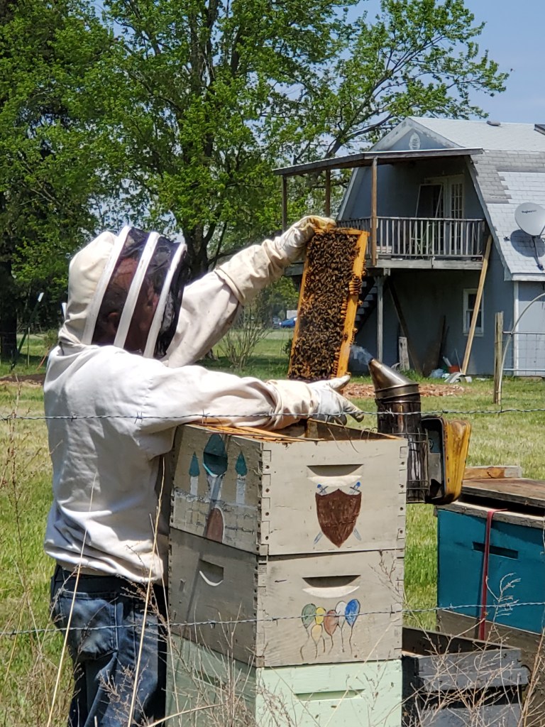 All the previous work on the bee equipment paid off. John was able to successfully split 8 of the 10 hives he manages, so now we have 18 hives! Bees automatically want to reproduce and they do this by swarming. As beekeepers, we split them before they swarm so we can manage all the bees. But, it is not always that straight forward. While John was working on a hive, the one next to him decided to swarm anyway! The bees clustered on a tree branch for a few days and then left. Even though we had bait boxes out, we didn’t catch the swarm. Hopefully they found our friend’s box!