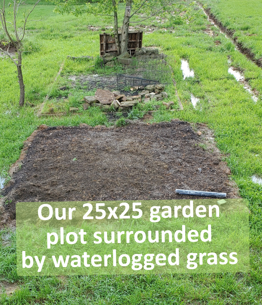 We are trying not to let the weather keep us from moving forward.  We’ve been tackling small projects in the loft and garage and we’ve worked more on the chicken coop.  During the breaks in the weather, John tilled our raised garden and we had some rabbit manure delivered to add nutrients to the soil.  We’ve decided to lay woven landscape fabric on the garden to keep weeds at bay.  Once we get a few dry days, we will transplant the seedlings to the garden and plant direct sow crops like carrots and green beans.  We had a few frosty nights this last week, so Katie was grateful we could still move the seedlings inside.