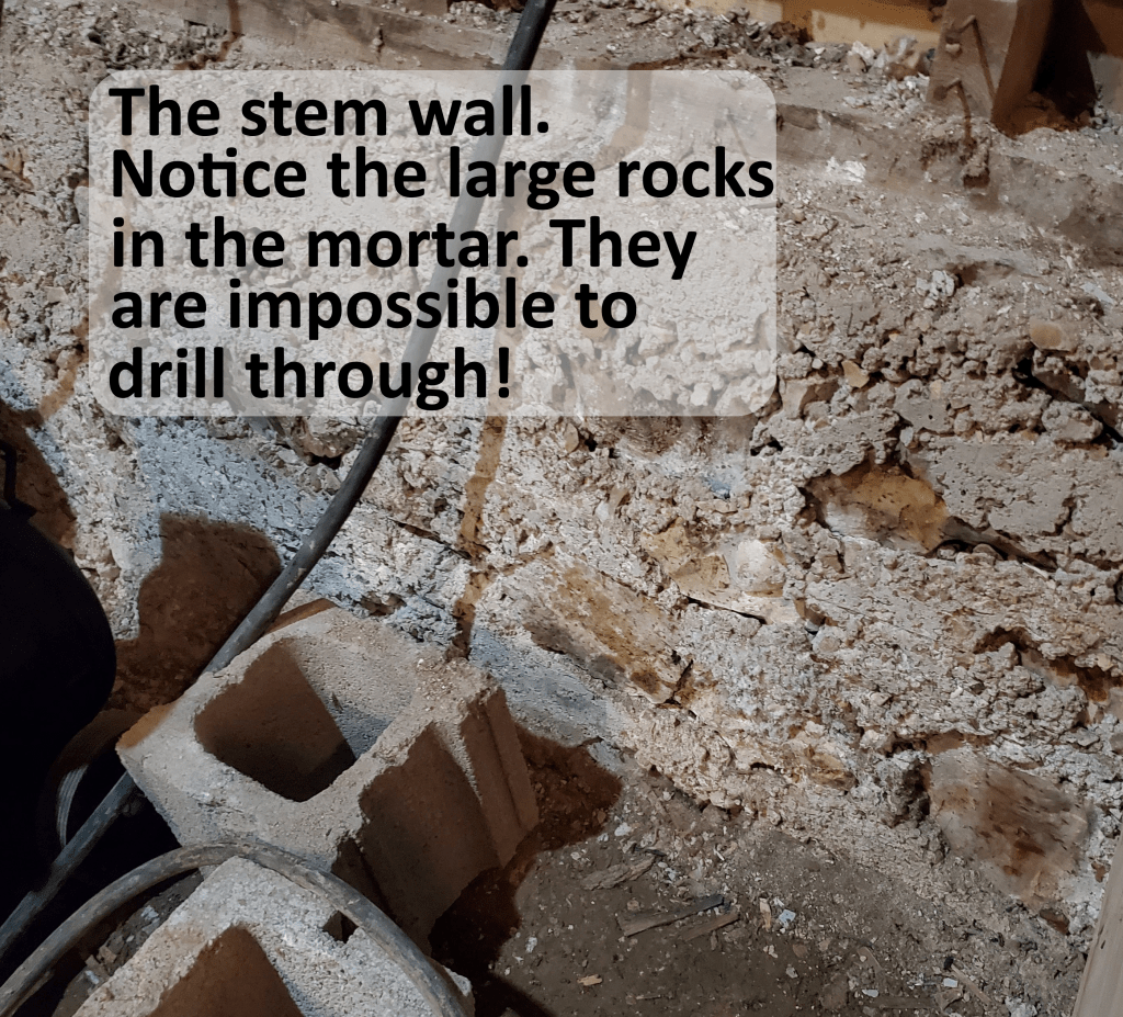 We built a temporary wall along the kitchen wall so we could take down the rotten wood.  We still don’t know how the roof has not fallen!  We laid down the sill. We had to use mortar to shore up the wall and level the sill.  It looks much cleaner now, and it’s more sturdy.  We have to drill 6” into the stem wall to secure the sill to the foundation.  We’ve mentioned before that the wall is from 1930 and is mortar and rocks found around the farm.  Drilling through rocks is not easy!  We actually broke a drill bit and burned out our drill. We can’t do anything else until all the sills are installed, so we are in a waiting pattern until we get another drill.