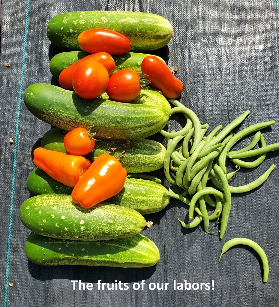 Our garden is not doing very well. We weren’t particularly confident when we planted it. We did not have time or money to amend the soil like we would have wanted to. Our soil is very heavy and full of clay. We did add a truck load of compost and rabbit manure, but we think it need MUCH more! Even after fertilizing, our tomato, pepper and green bean plants are all about half as big as they should be, and producing about a quarter of what we expected. The cucumbers are going crazy, however. We can go from a 2” starter to 8” overgrown in 2 days! We have to pick twice a day to keep up with the growth – none of us like the overgrown cukes. Hopefully this week, we will try to dehydrate cucumbers to use in salads and soups after the fresh veggies are gone. For our fall garden, we are only going to grow cabbage, beets and spinach. We really need to keep it simple so we can spend as much time as possible on the house. We did get some great flowers, which we’ve been cutting and bringing inside! We’ve never planted flowers in our garden, but I think I’ll continue to do so. They add a smile while we are weeding!