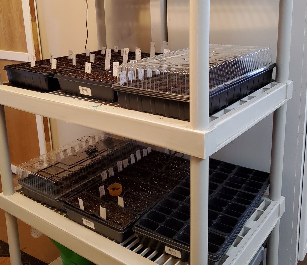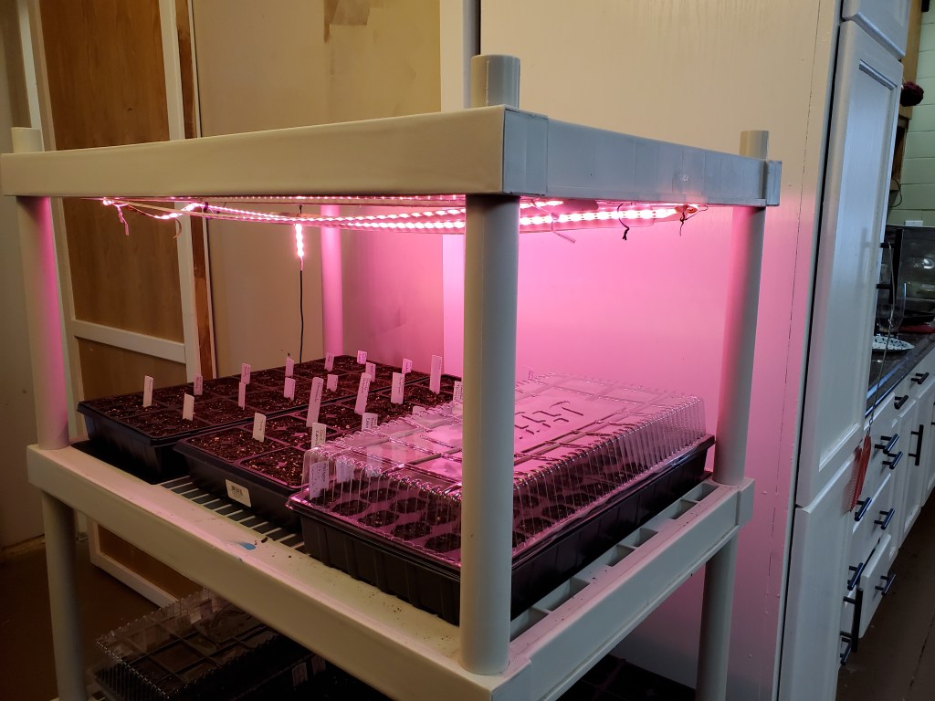 This Saturday was our first full day not working on the house. The high was 10 degrees! Katie did the most logical thing – she planted seeds! Our last frost date is around April 20th. That’s just under 10 weeks away so it was time to get those early seeds in. She planted cauliflower, broccoli, spinach, lettuce, Swiss chard, 8 kinds of onions, kale, cabbage, flowers and a host of herbs. She planted almost 1,000 seeds and put them on heat mats. Once they sprout, we will turn on the purple LED grow lights. If they all germinate, we will be selling seedlings. Tomatoes, peppers, and a host of other herbs and vegetables will be started in about a month. We definitely plan to start more than we need so we can sell seedlings. We’ve already had a few inquiries, so if you want us to save some for you, let us know asap!