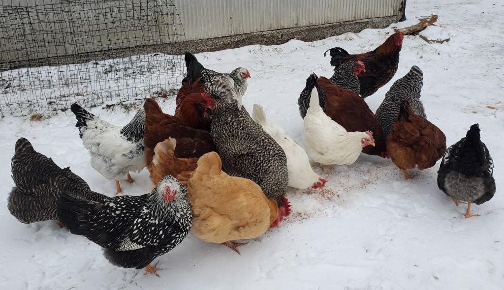 Our chickens, however, don’t seem to mind the cold. As soon as we opened their coop, they all came running out to play in the snow and get some treats.