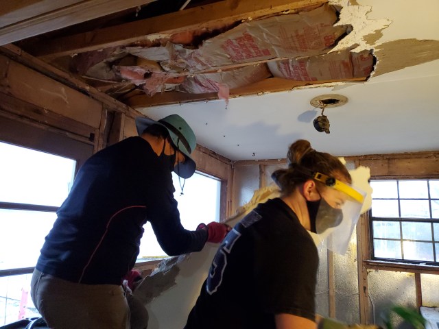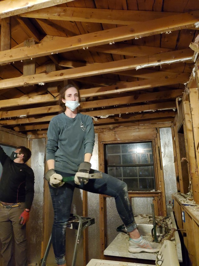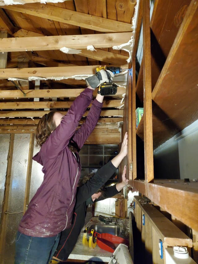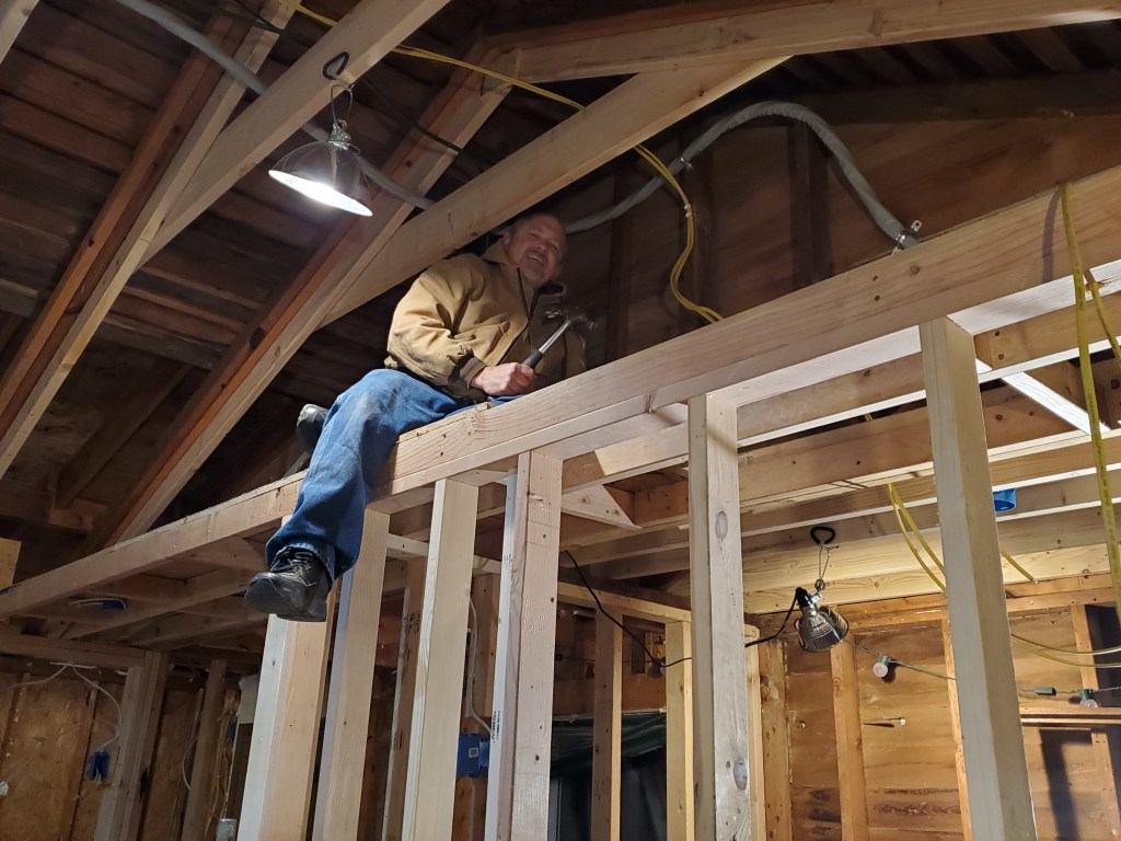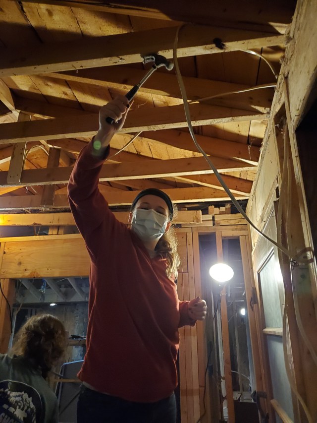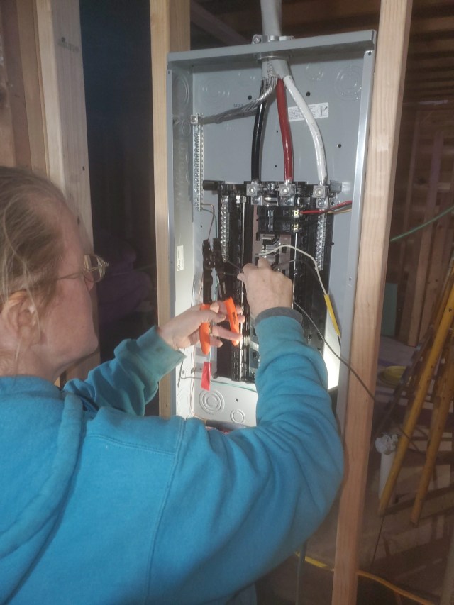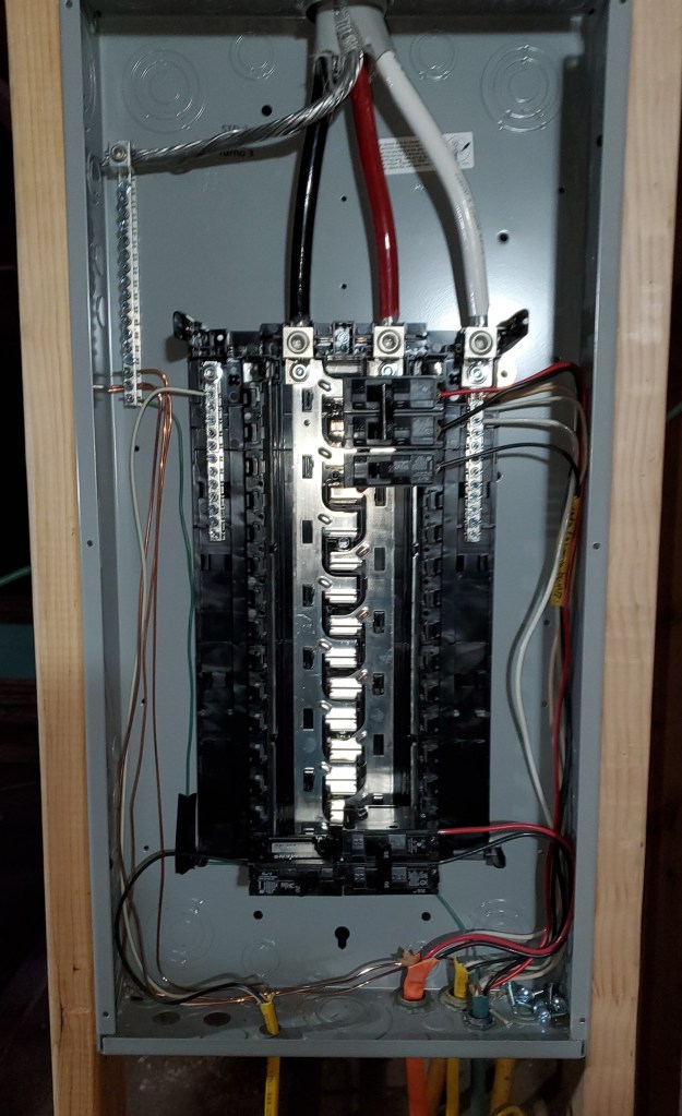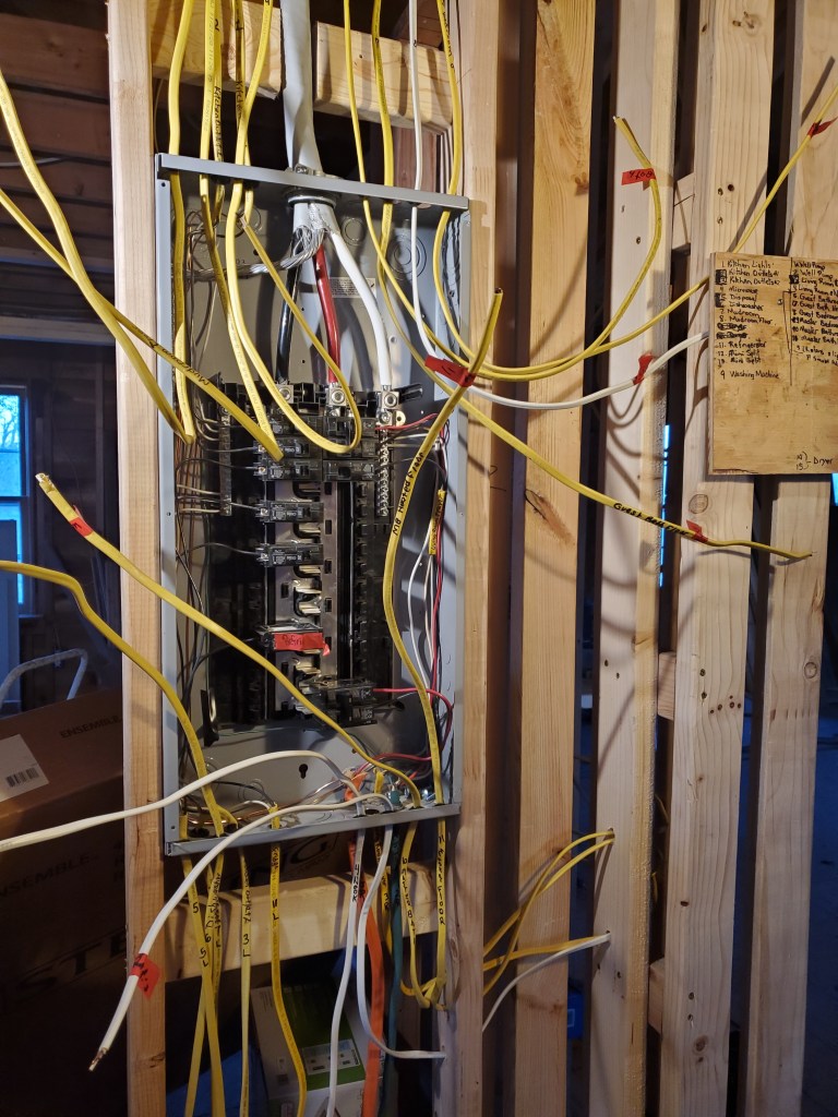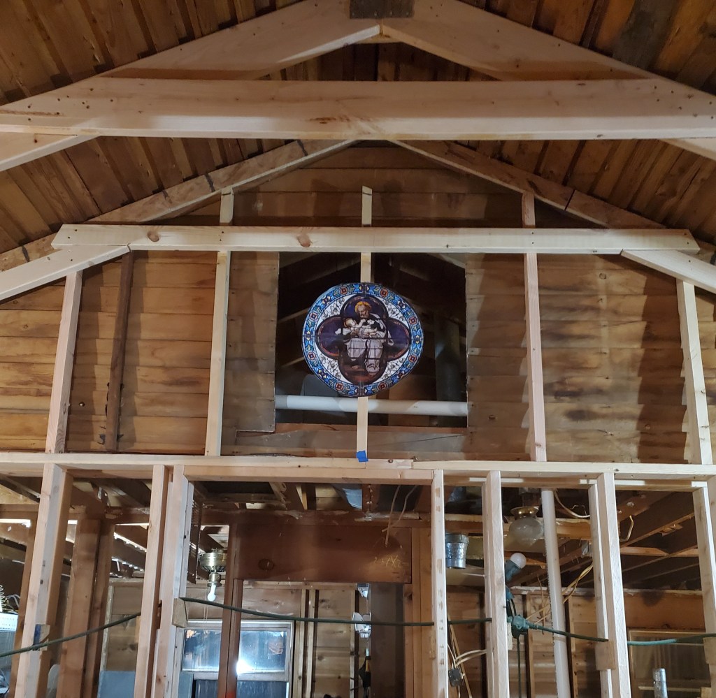 After Christmas, we spent a week in Alabama with Katie’s family and our niece’s wedding then returned home to get back to work. We hired a master electrician to remove the old conduit, upgrade our meter and run new electrical service to a new (and empty) panel in the house. Thank goodness Katie has been studying how to wire the house and is a confident electrician, YouTube Certified. She is actually quite amazing and has done a very professional job hooking all the electrical lines and breakers to the panel. And because we are doing the wiring ourselves, we can add outlets in unique places, like in the attic to light up our stained glass window, or on the shelf over the nook where we can plug in Christmas lights!