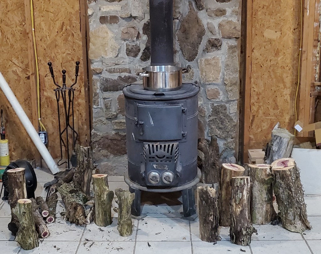 Drawing closer to inspection day and the stress and exhaustion and cold is getting to us. We have continued to burn in the wood stove and use space heaters in the house to make it bearable. Often we have to bring in wet wood for the furnace so we cut it to length on the chop saw then stand the logs around the stove to dry out. At one point we turned and looked at the wood and couldn’t help laughing at the sight of what looked like little wood children standing at attention around an old stove, listening to a story.