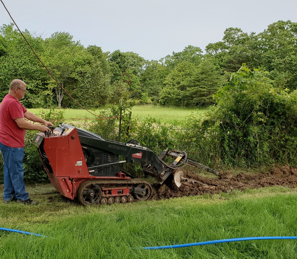 The spring rains finally slowed down, so we decided to dig trenches to facilitate better drainage and to lay down 200 feet of pex hose for outside water spigots. The pipes to the 2 spigots we had burst during The Big Freeze! We rented a trencher. It made quick work of the job, for the most part. But, as has been our “luck,” it became a big ordeal! Our yard is a mix of clay and Missouri rock. But in one spot, it was mostly clay – and because of the rain, it was saturated ooey gooey clay. You guessed it, the trencher got stuck! And, it happened less than an hour before we had to return the equipment or get charged another full day rental. We used the truck (in 4-wheel drive) and the tractor, and after several attempts from various directions, we were able to pull the trencher out of the trench, wash the mud off it and return it with about 2 minutes to spare!