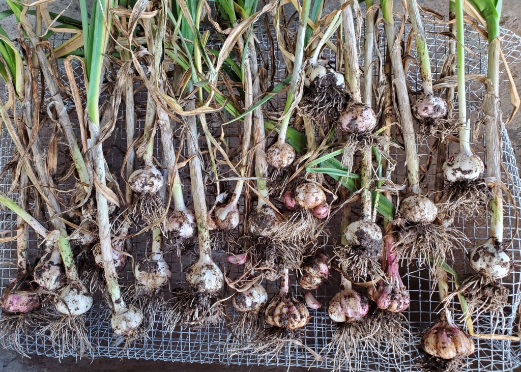 In early July, I realized that all my garlic has grown scapes. I noticed it a little too late and they were all hard. That meant I had to harvest it all. It was actually quite fun digging up the garlic – every single clove I planted grew into a full head! We set them out to dry for a few weeks. Once they were dry, we split all the heads, peeled the cloves, and are storing them in olive oil in the refrigerator. We processed them this way because these were hardneck garlic and we let the scapes get too big, the cloves won’t last as long in our storage bins. Do you want a great tip on how to peel garlic? Take 10-15 cloves and microwave them for 10 seconds. Immediately, roll them in a kitchen towel and then peel them. It is MUCH easier!