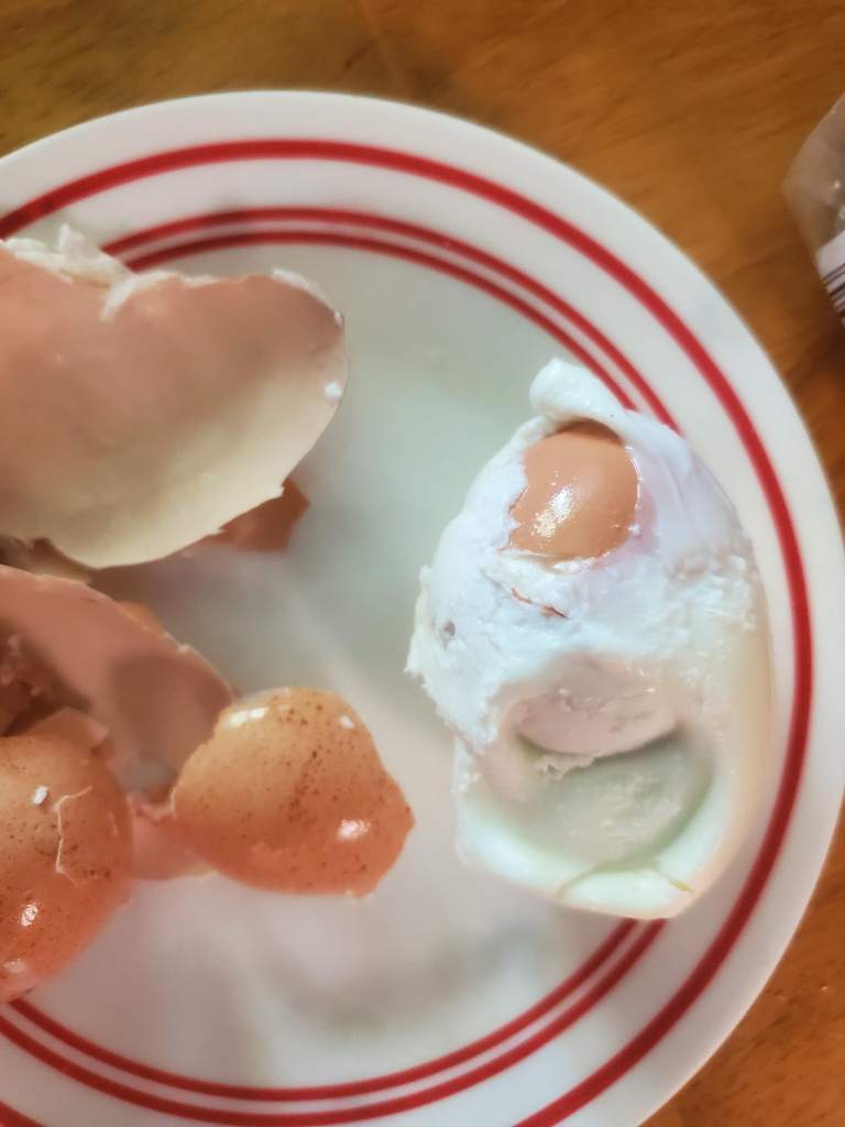 We were surprised to find a HUGE egg in our nesting box one day. We knew it was unique, so we took a video as we cracked it open. We thought it might be a triple yoker, but were surprised to find that it was indeed a triple yoker, but also an egg within an egg! This picture is a screenshot from the video. A few days later, we had another huge egg which we hardboiled. When we opened that one, we found another whole egg inside.