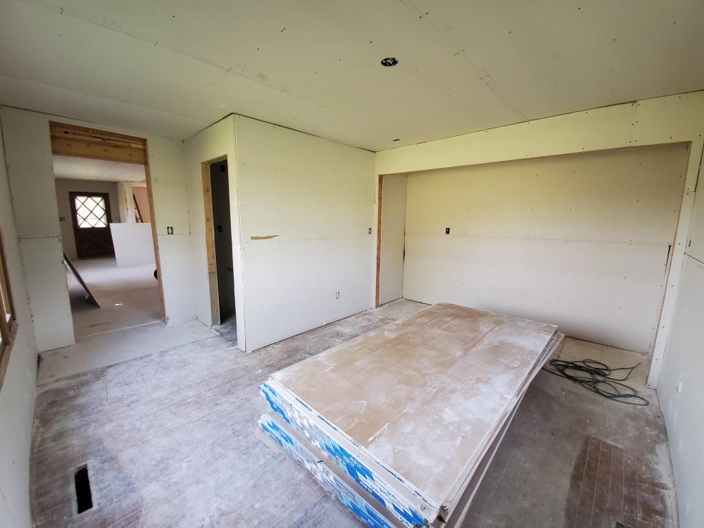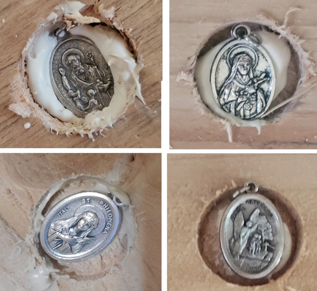 We buckled down and worked feverishly to get our house somewhat livable for the guests we were expecting. At the beginning of the month, we installed heated floor wire in the guest bathroom and then leveled the floor with cement. It is not perfect, but it will work! Last month, we tried to dry wall the bathroom and dining room nook, but it took us 5 days to hang 5 sheets of drywall. We decided to hire someone to hang the drywall for us. He knew we had guests coming, but there was not enough time for him to hang and mud everything. He was able to hang all the drywall, and get the guest bathroom mudded so we could tile the bathtub area, install a toilet and temporary sink for our guests. That was a huge relief. Before he hung the drywall, though, we took some saint medals and embedded them in the rafters and over every door and window. We ask these saints to pray for us and all those who come into our home.