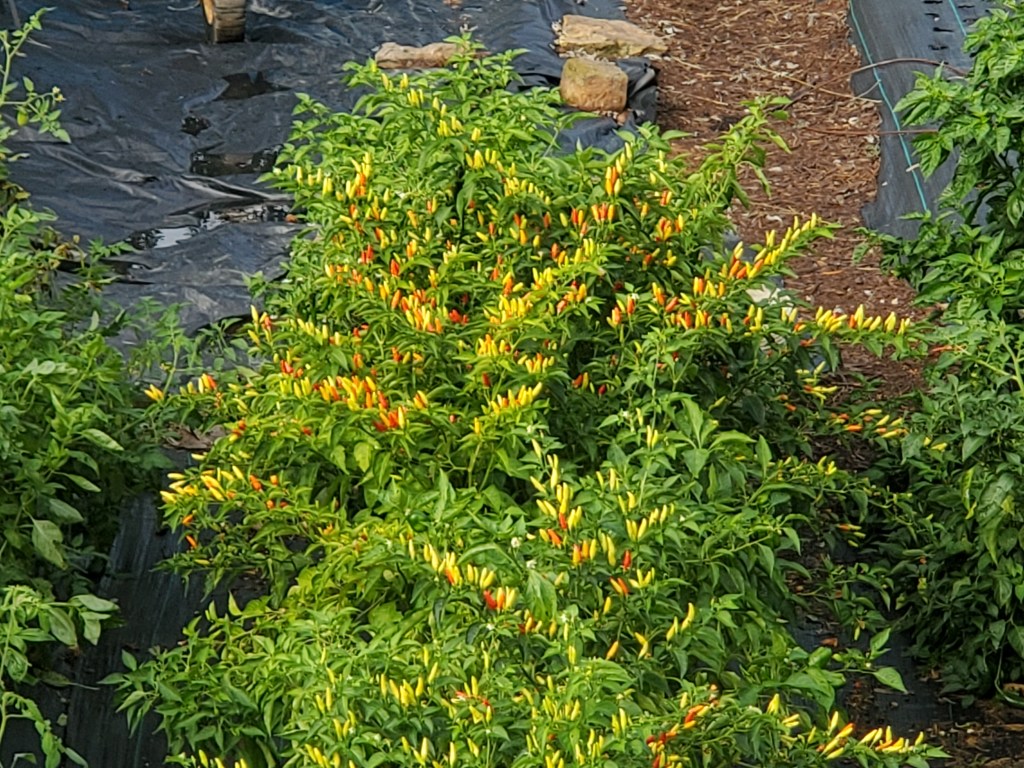October 30, 2021 – Fall has come! The weather is cool and crisp, but still sunny. We seem to get energized with the change of the seasons! We were blessed to have American persimmon trees on our property. Generally, you know they are ripe when they fall to the ground. John shook the tree every few days and collected the fruit that fell. He deseeded them and froze 2 full gallons of the flesh! The garden is still producing too! Look at this tobacco pepper plant! We bottled more tobacco vinegar.