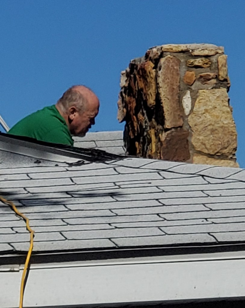 Back at the farm, we had some leaking around our fireplace, so John tuckpointed the outside of the chimney and installed a new chimney cap.
