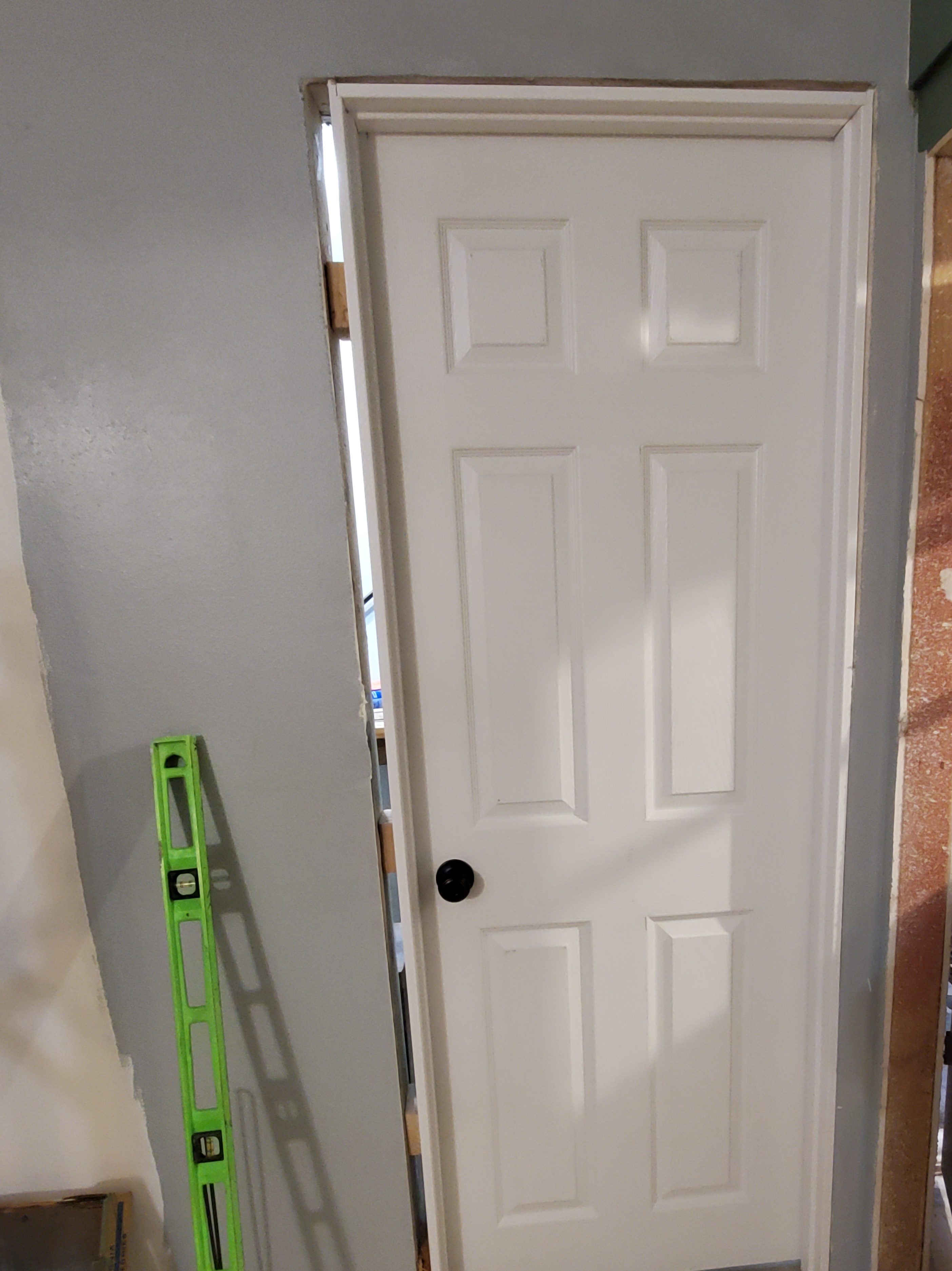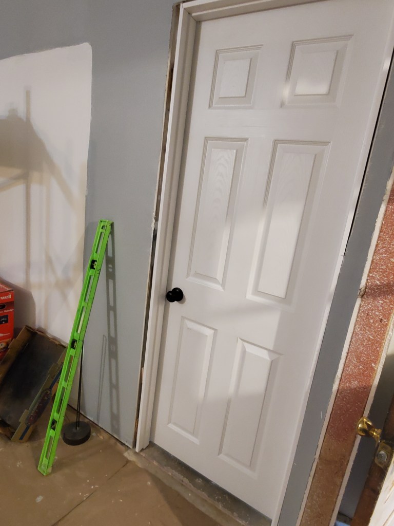 The next step was adding doors. We watched so many different videos to be sure we hung them correctly. It was amazing that a few of the doors installed very easily, but others took 3 or 4 or 5 or 6 tries, especially on the walls that we did not replace! One of the existing walls is neither plumb nor level – yikes. We kept repeating what our structural engineer told us: “It is an old house!”
