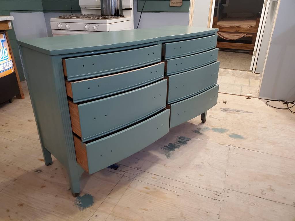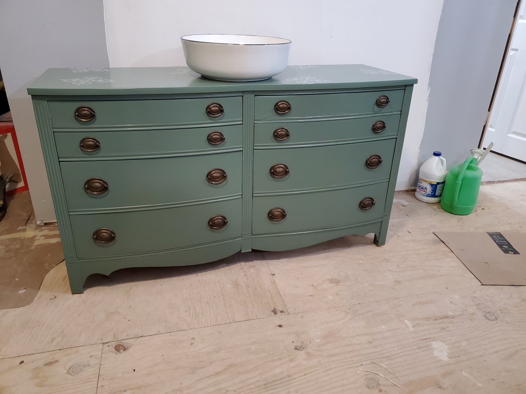 After Thanksgiving, we purchased a second-hand dresser to use as the vanity in the guest bathroom. Katie stripped it, primed and painted it. After John cut the legs down (it was too tall) Katie added decorative stencils to the top of the vanity. We will have to make some adjustments to the drawers to accommodate the vessel sink but are excited to install it in the bathroom.