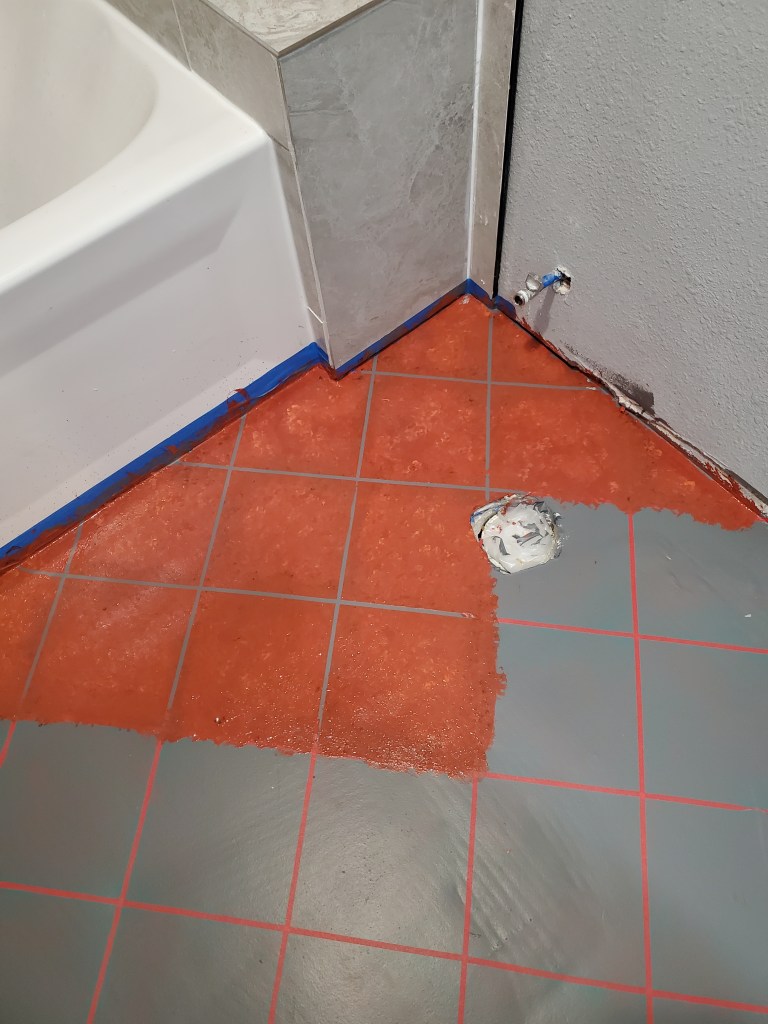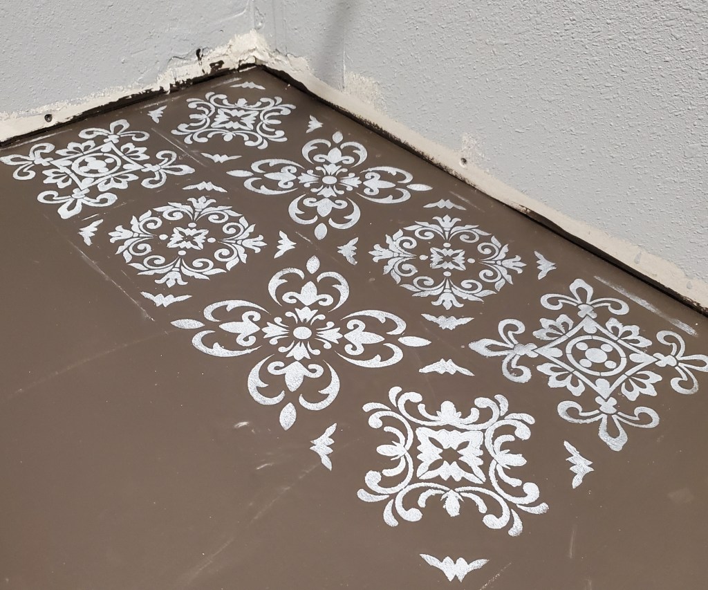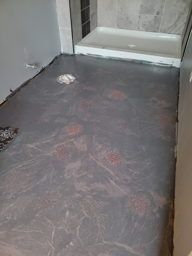 Katie tried to paint a stencil on the master bathroom floor to make it look like tile. All the videos make it look so easy. Not so. After several tries, and painting over failed attempts, we settled on a marbled grey look with single terracotta stencils here and there. The benefit of painting the floor is that if we decide we don’t like it, the cost to change it is minimal.