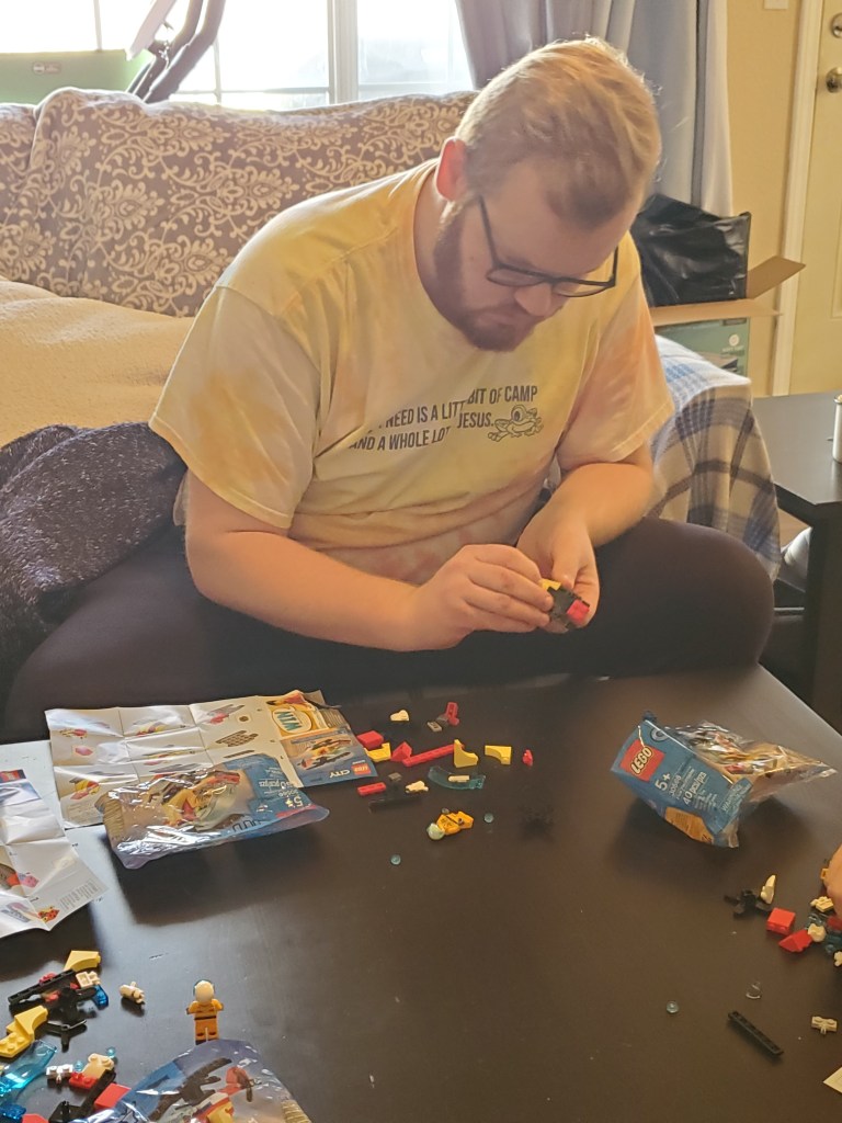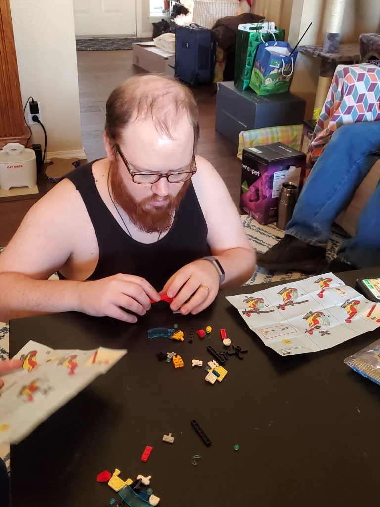 Since Nicholas had to work Christmas (he’s a Deacon now), we decided to wait until last Monday to celebrate the holiday. We all traveled to Tulsa and had a wonderful Christmas celebration with Eric and Amy at their home. Each of the “kids” got a Lego model in their stocking and we had a contest to see who could build theirs first. Amy won!