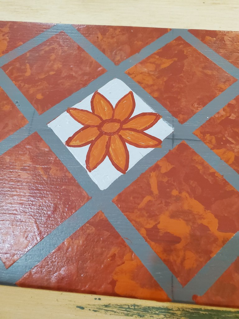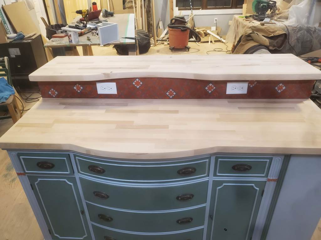 This month, we focused on getting the kitchen island finished. One of Katie’s colleagues gave her the buffet that we are using for our island. The original style did not fit in our farmhouse look so we painted it. Unfortunately, we learned that it was made of mahogany which bled through the paint in ugly orange blotches. Katie had to strip it, prime it and repaint it. We then built a book case on the side to make it a little more substantial and added a bar to give more counter space. To carry on the look from other parts of the house, Katie painted the back splash on the island in a terracotta tile pattern. We purchased and cut a big piece of butcher block to use both as the island countertop and the bar. Since we knew we would be preparing food on the wood, we stained it with several coatings of coffee and tea until we got the shade we wanted, and then sealed it with food-safe oil.