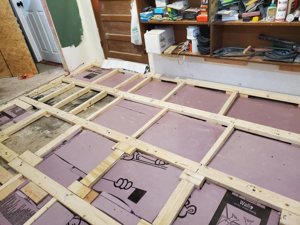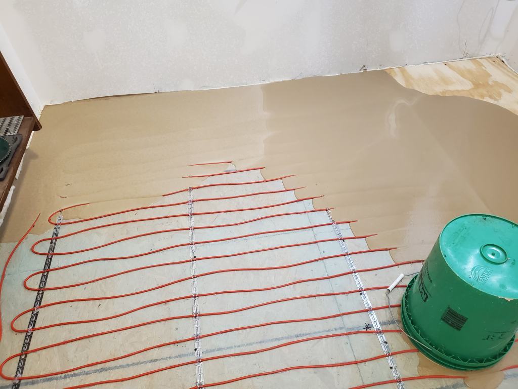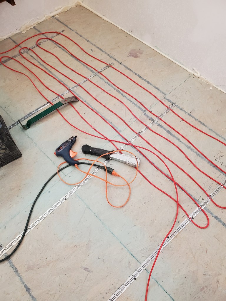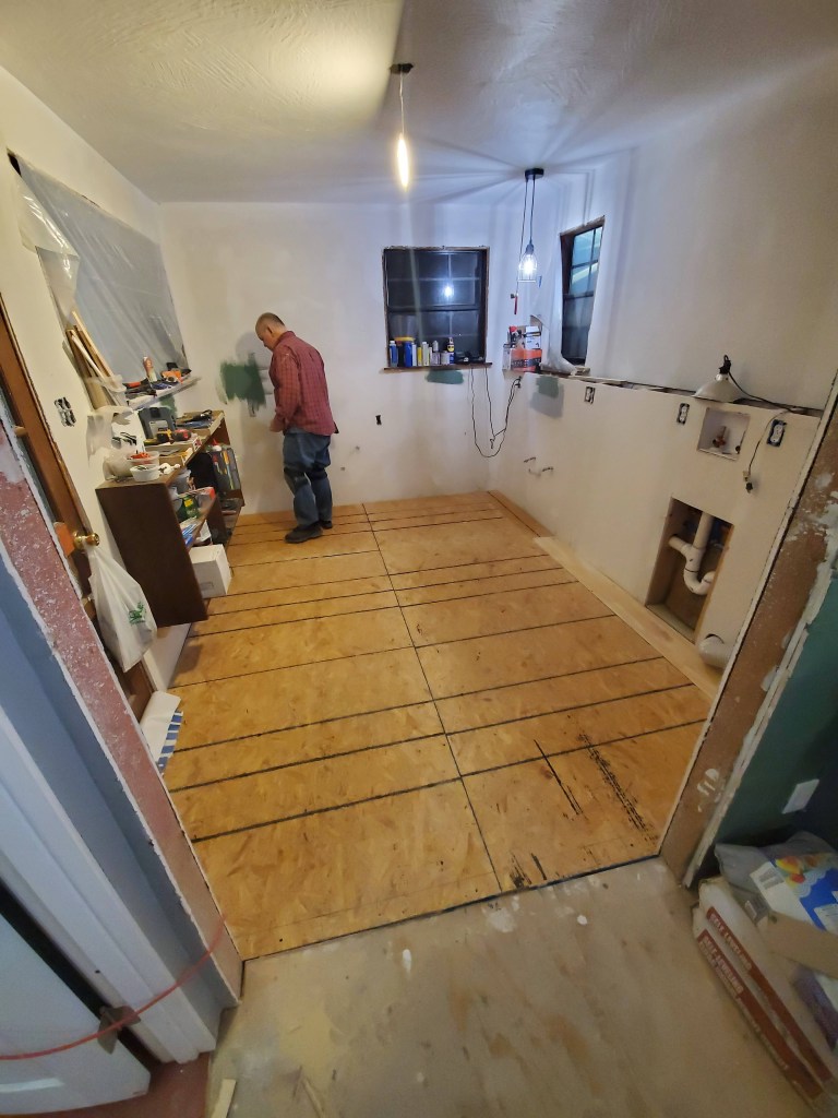 The last major building we had to do before we could install cabinets was to raise the mudroom floor. The floor was about 4” lower than the rest of the house and we want that room to feel like an extension of the kitchen (we are going to keep our refrigerator in there to make more room in the small kitchen). We built a deck over the existing floor, added the heated floor wire, and then self-leveling concrete to make it all even. We are going to put laminate plank flooring throughout the house, including in the mudroom.
