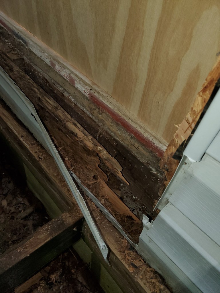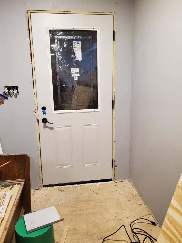 Joshua was also helping us replace our front door when he had another huge surprise. The wood that supports the front wall (and therefore the door) was completely rotted! This piece of wood is called a skirt. Fortunately, only about 5’ of it was rotted. Joshua and Katie were able to remove the bad wood and replace it with new wood. They were able to get the new door hung, just a day later than planned.