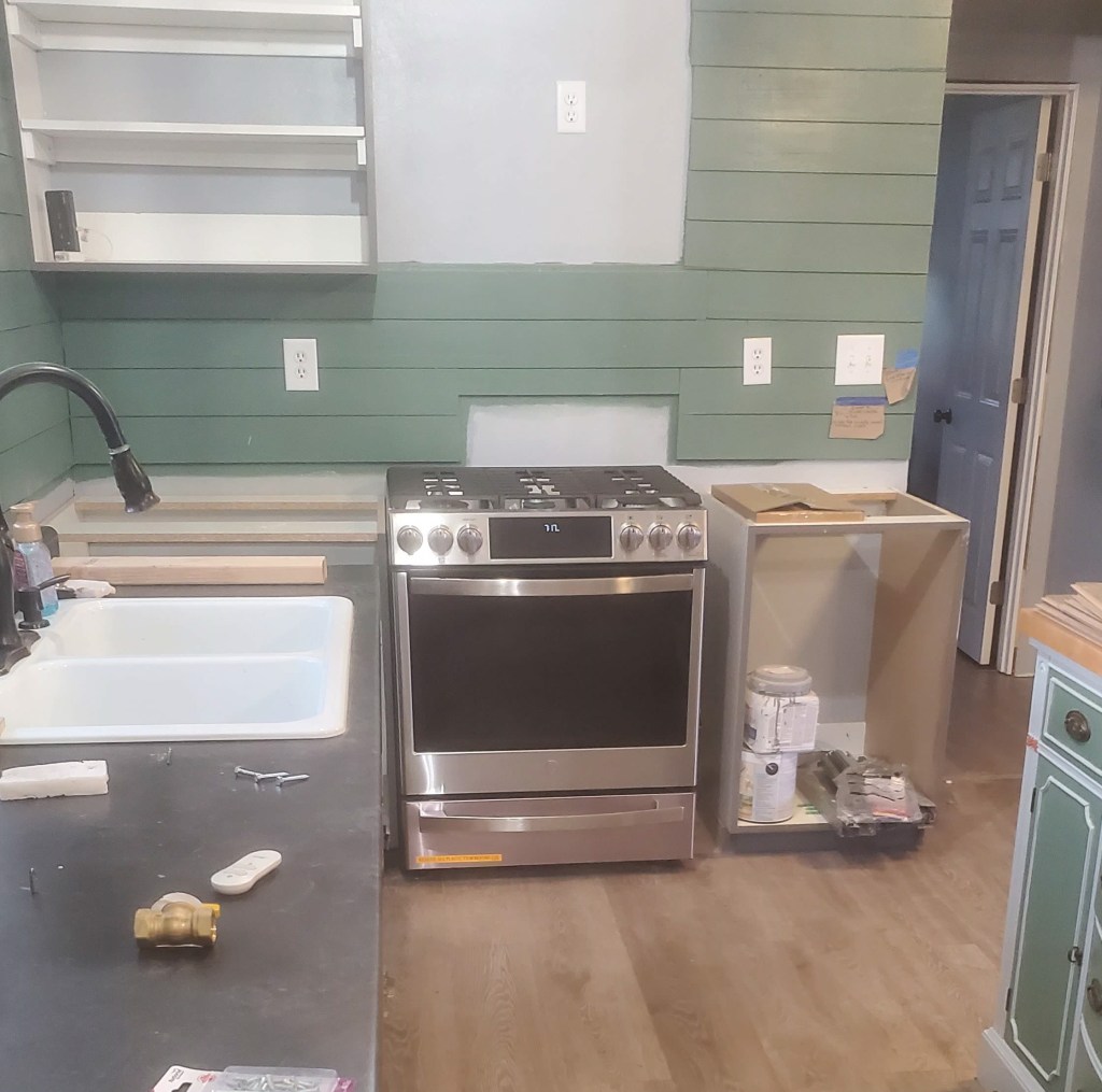 When we first purchased this property, we also bought a second-hand gas stove. When we went to install it, we realized it was not set up for propane and the conversion kit was no longer available. We decided to go ahead and buy a brand new range! We’ve NEVER purchased a new range before. And since we will probably have this one for a decade or longer, we made sure to get one that will meet our needs. You can see that it is a different size than what we had planned, so we will have to adjust the shiplap on the back wall. Easy fix. This stove is big enough that we can run all four of my canners at the same time! Believe it or not, the oven is wifi compatible. We can’t use that feature since we don’t have wifi right now, but it is kind of neat to know that’s available. We have not had an oven or full stove since September 2019. I’m so excited to cook something!