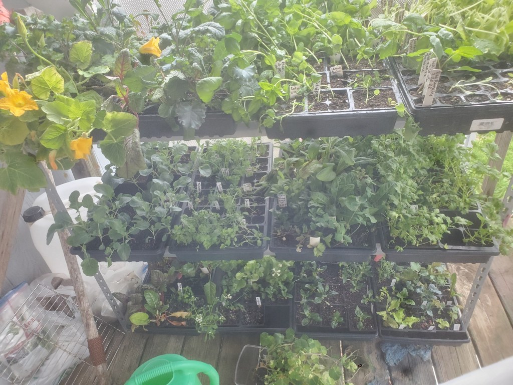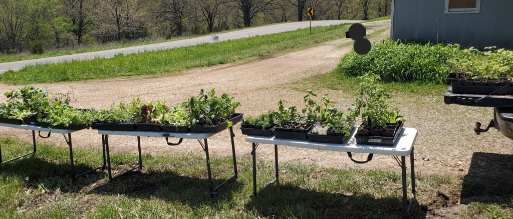 Today, Katie held her annual seedling sale at the farm. She already sold most of her starts to co-workers and friends, but she still had a fair amount to sell today. She did not start as many seeds as last year – We are really trying to prioritize the house and apple orchard. She sold about 500 seedlings.