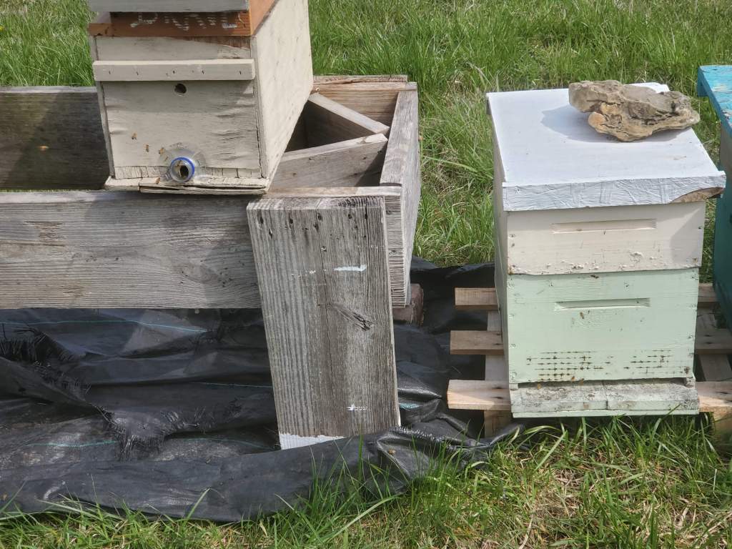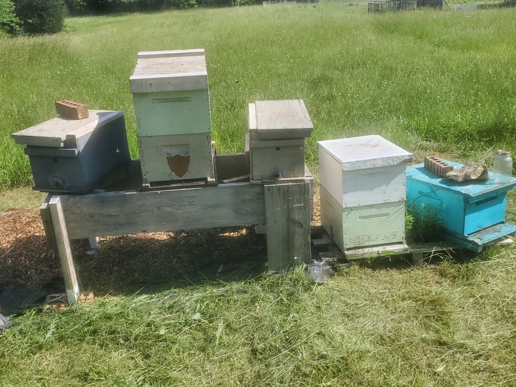 Some farm chores don’t care how busy you are, and that is the case with our honeybees. In the spring, bees want to swarm to make new hives (that’s how they reproduce), so we split them ourselves to avoid the swarm. We have 2 hives at our farm. that we turned into 4. John also takes care of bees for a group of nuns and mentors 2 other beekeepers. He spent time with each of those this month, splitting their hives.