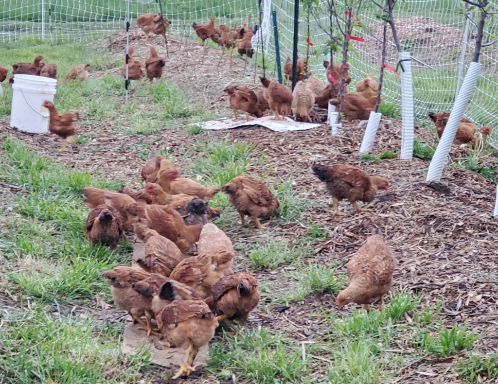 As busy as we were, we went ahead and added to our backyard flock. We purchased a dozen turkeys and 8 baby chickens. We will raise them all together until the turkeys get too big. Turkeys are not very smart and the chickens will help them learn where the food and water are. The turkeys are very social and don’t scatter when we come by. The Big Red Broilers are growing well. We had them in 2 pens that get moved at least once a day to fresh grass. The meat chickens eat the bugs and the fresh grass and deposit their fertilizer. Because they were getting so big, we decided to take them out of their pens and let them free-range within an electric fence. I love watching them run after bugs!