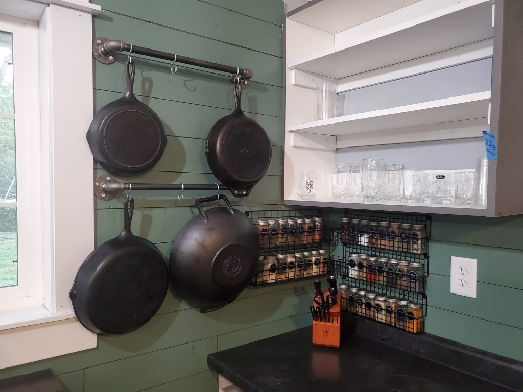 We installed black iron piping in the kitchen to hang our cast iron skillets. We also installed the same type of pipe in the master bedroom closet to hang our clothes. With our son Joshua’s help we got the Saint Joseph stained glass window installed over the great room. He also built steps to the back door with railing for easy entrance. Boy is he a hard worker and a blessing.