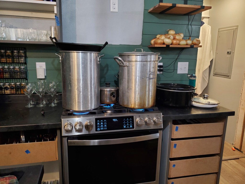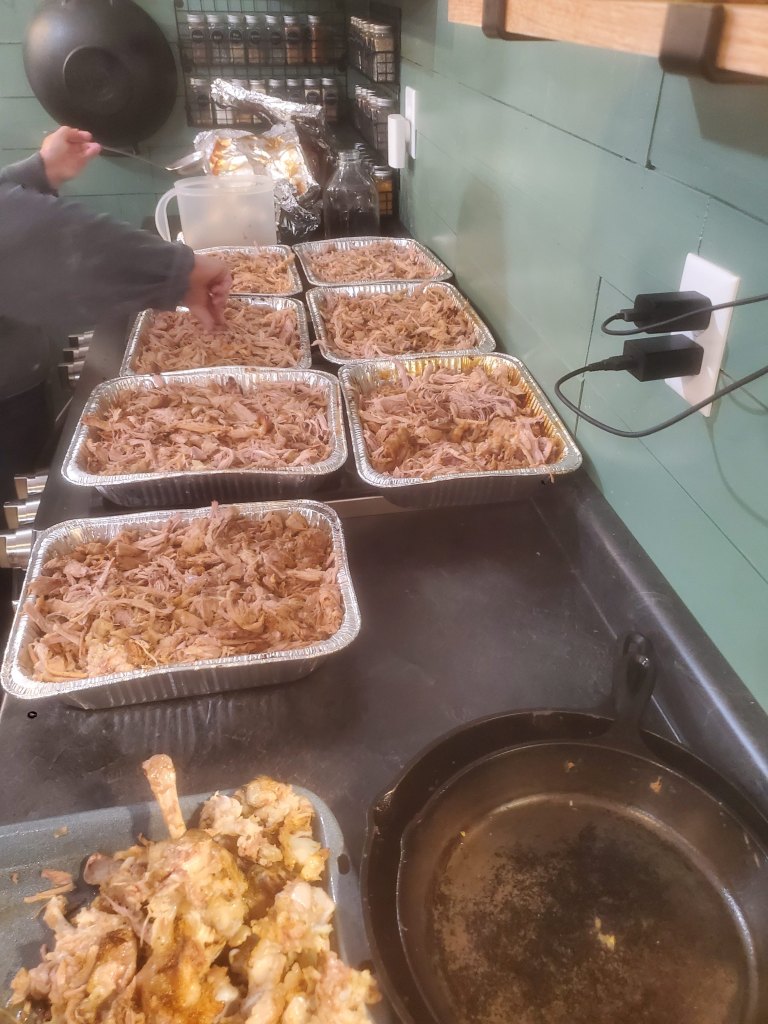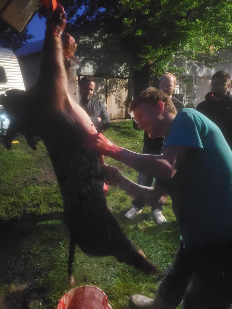 The following day a bunch of our friends came out to roast a pig. It rained and rained while the men dug the pit. The hole kept filling with water so we had to get creative and raise the pit above the ground level. Thank goodness we had a tractor! There was a lot of water and mud but we made it work and had a fun time. We put our new stove to work as we boiled copious amounts of water to process the pig. We made some great memories. Isn’t that what it’s all about?