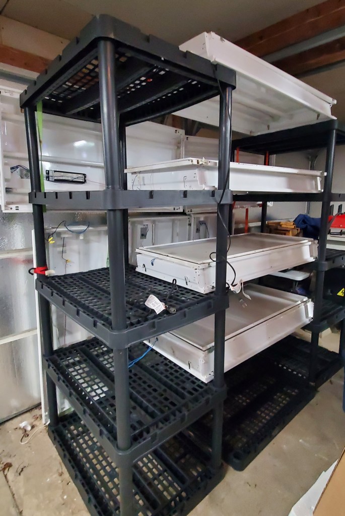 I use the space on the black shelves where there’s no direct light above to germinate my seeds (most seeds don’t need light until they have leaves). I have heat mats set up in those areas. I start new seedling trays every 3-5 days, as I have space on my heat mats. I’ve not found the need to purchase more heat mats and the staggered seed starting has worked fine for me.