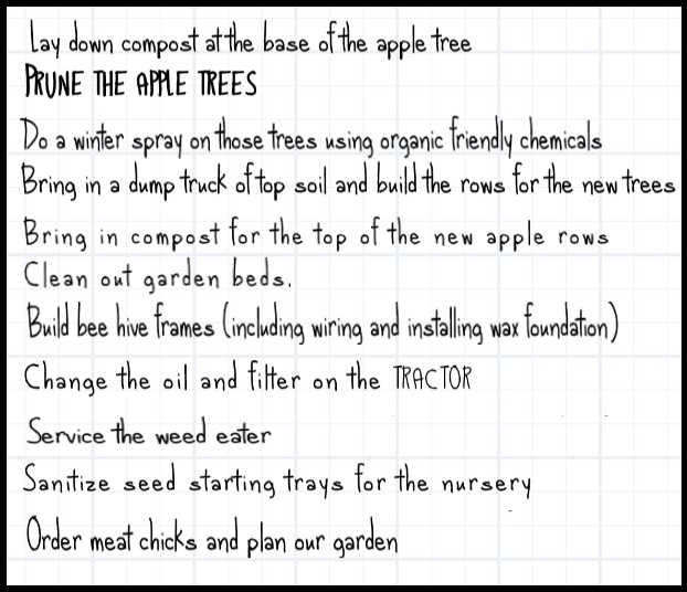 Looking at our list and the weather forecast, we determine what will be our focus this week and schedule out our different tasks. For instance, snow and ice cold are forecast for this week. So, we will tackle our inside projects such as ordering topsoil, sanitizing seed trays and even doing some meal prep. Having meals planned and even made in advance saves us a lot of time and reduces anxiety. It’s difficult to come home from a full day of work and try to make dinner when we still have farm work to do. Every morning or night, and especially on the weekends, we chip away at our to do list.